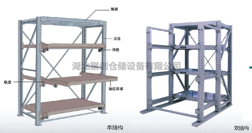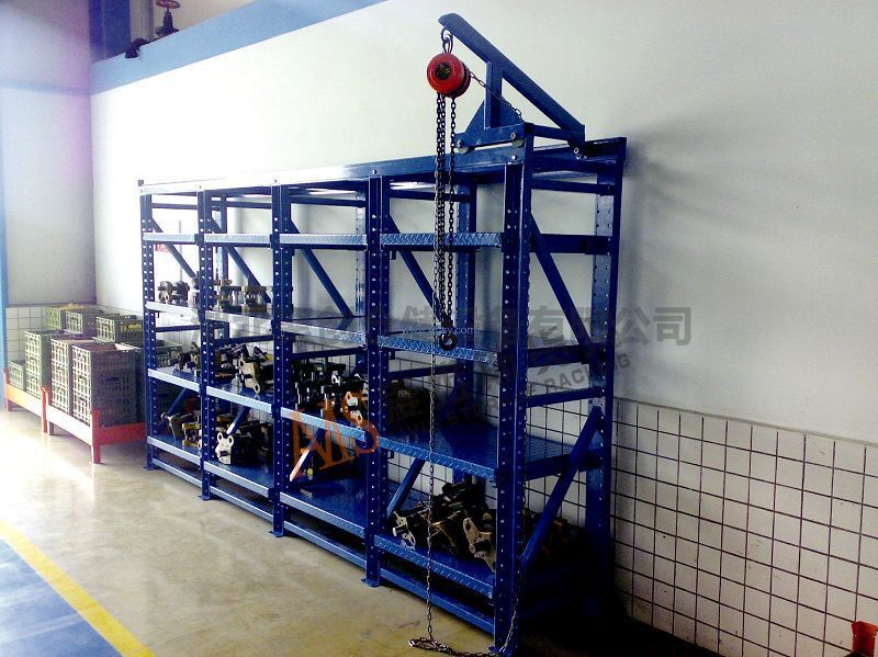 模具貨架主要由立柱片、抽屜層、拉桿、自鎖裝置等組成,使用于存放各種模具,一般成排使用,頂部可以配置手拉葫蘆可水平移動小車可以方便模具的起吊,抽屜層可以移出2/3.抽屜層主要由滑軌、層板組成,層板由于受力框架和鋼板組成。每條滑軌由兩個軸承前后上下固定,可以再導(dǎo)向槽內(nèi)隨意滾動,阻力小,可以單手輕松拉出抽屜,降低了勞動強(qiáng)度。自鎖裝置由定位彈簧及銷軸組成,保證了抽屜就位后不能再動,而在形程范圍內(nèi)不影響抽屜運(yùn)作。